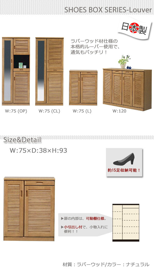 ルーバー扉 シューズボックス/下駄箱 単品 【ナチュラル】 幅75cm 可動棚付き 〔玄関収納〕【代引不可】 送料込!