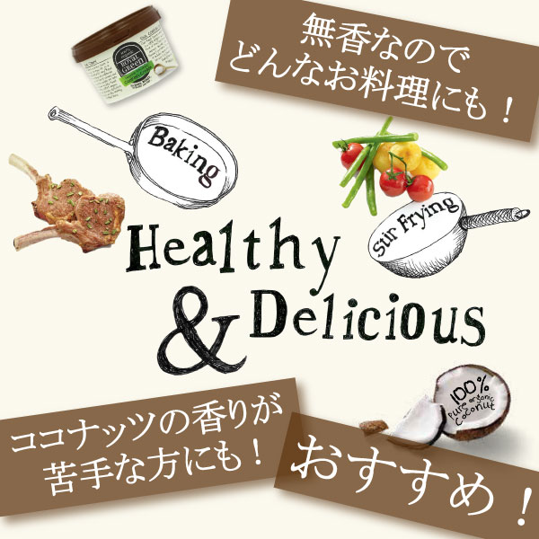 商品特徴 香りのしないタイプ! 100%オーガニック! ラウリン酸50%配合! コレステロール・トランス脂肪酸 ゼロ! お召し上がり方 バターやマーガリン、オリーブオイル、サラダ油の代替品として、炒めもの、揚げ物など様々な調理にお使い頂けます。